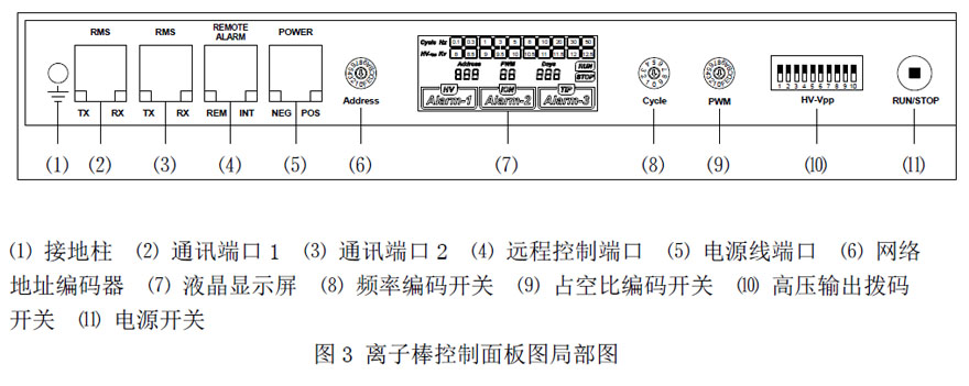 7、通訊功能:從圖2 可知,可通過位于控制面板上的1 個(gè)RMS 端口實(shí)現(xiàn)離子棒工作信息傳送至PC;另一個(gè)RMS 端口實(shí)現(xiàn)2 個(gè)智能化離子棒串聯(lián)通信;亦可通過REMOTE 端口連接至遠(yuǎn)程服務(wù)控制器。